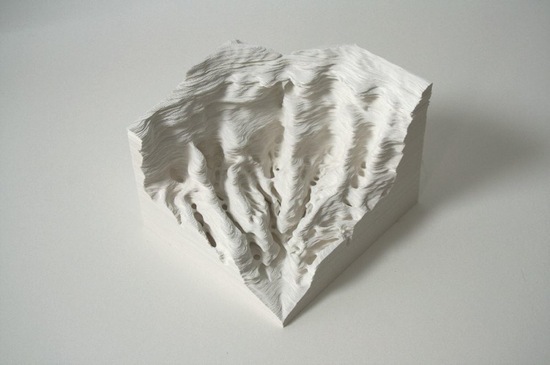 of paper to create an undulating surfacing, reminding me of a topography map. She cuts each piece of paper by hand so that